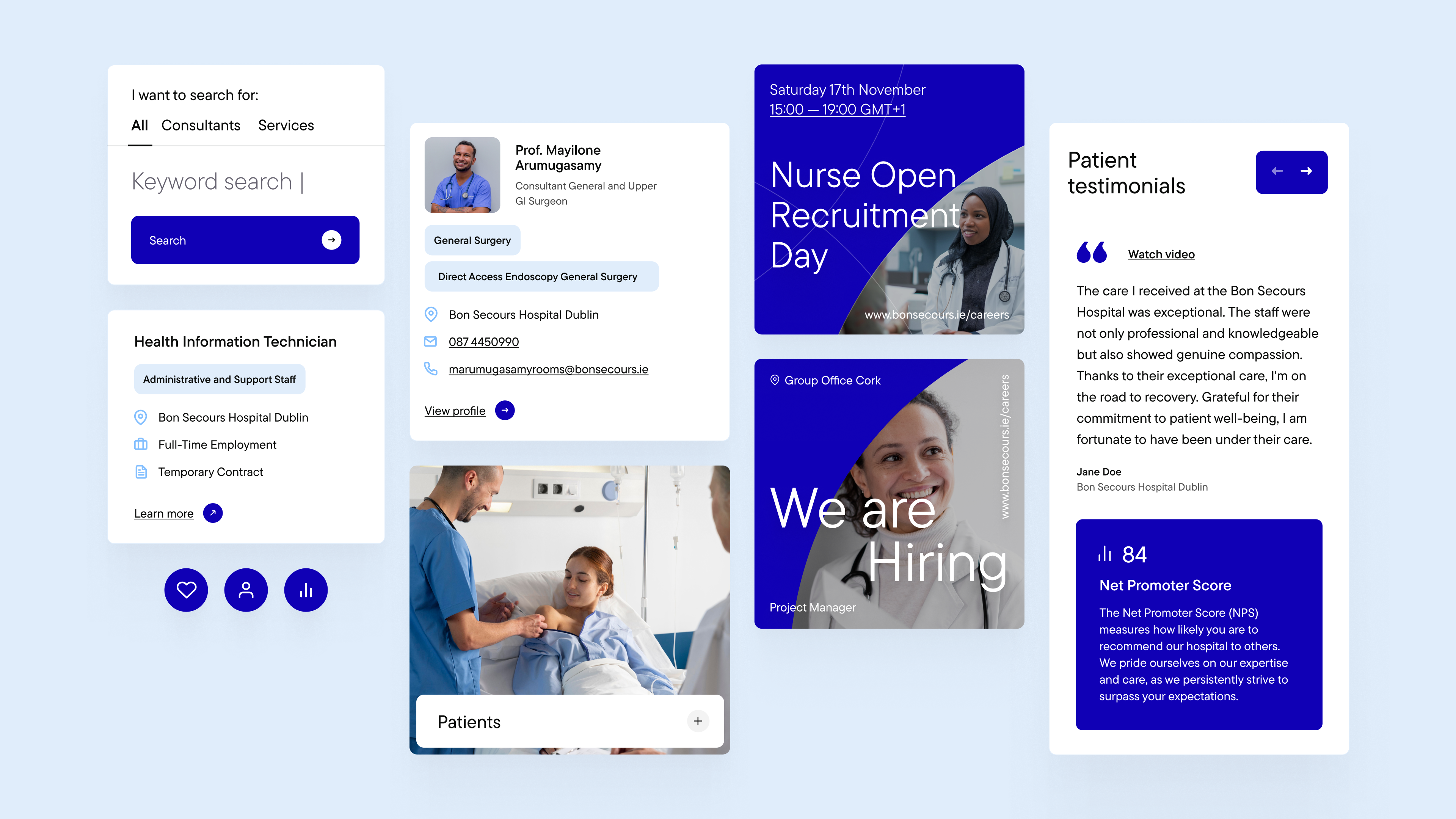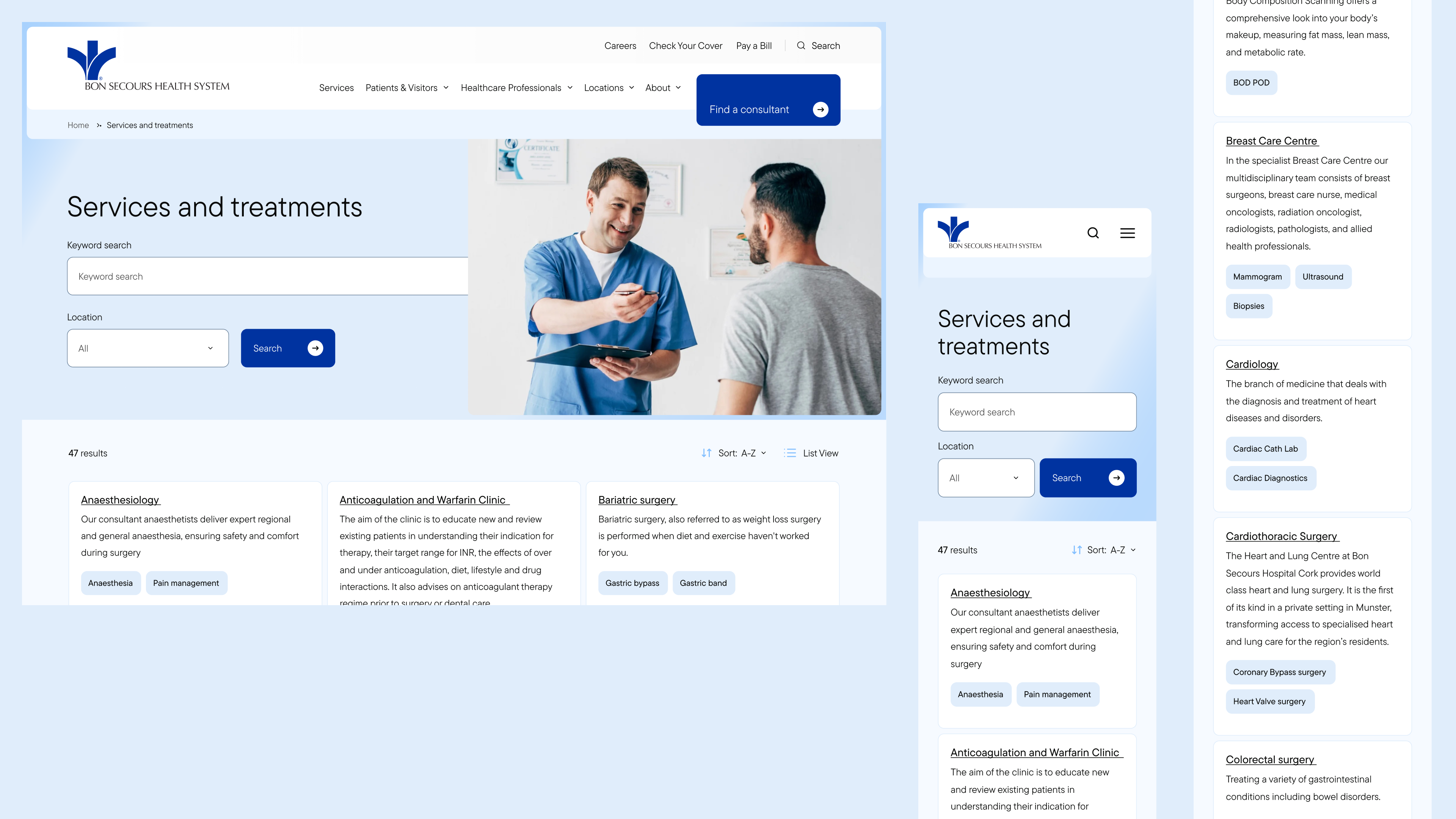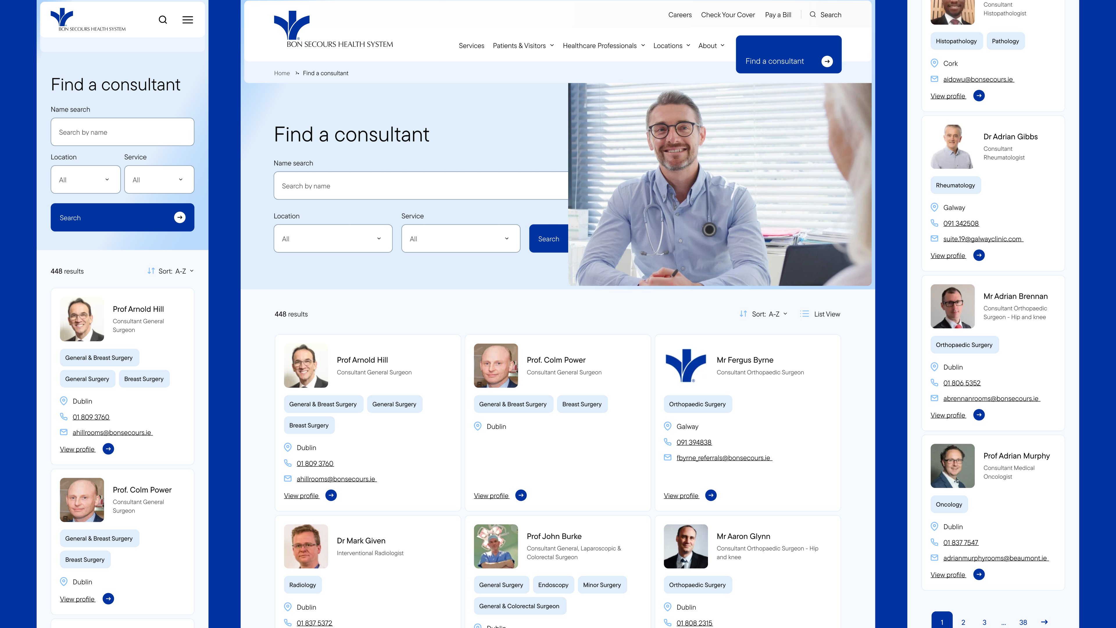 Kooba began the Bon Secours project with a methodical approach, identifying and researching a range of personas who would be interacting with the final website. The information architecture of the website was made according to these typical users and their predicted behaviour and needs. This included designing specialised landing pages for patients, visitors and healthcare professionals. This user-centric approach to the site’s layout ensured that a wide variety of users could easily access the information that was most relevant to them. It was also essential that key information could be quickly found across the site, and to address this a robust, filterable consultant directory was introduced, offering up-to-date details on specialties, availability, and costs, alongside enhanced search functionality for quick access to services and referrals.