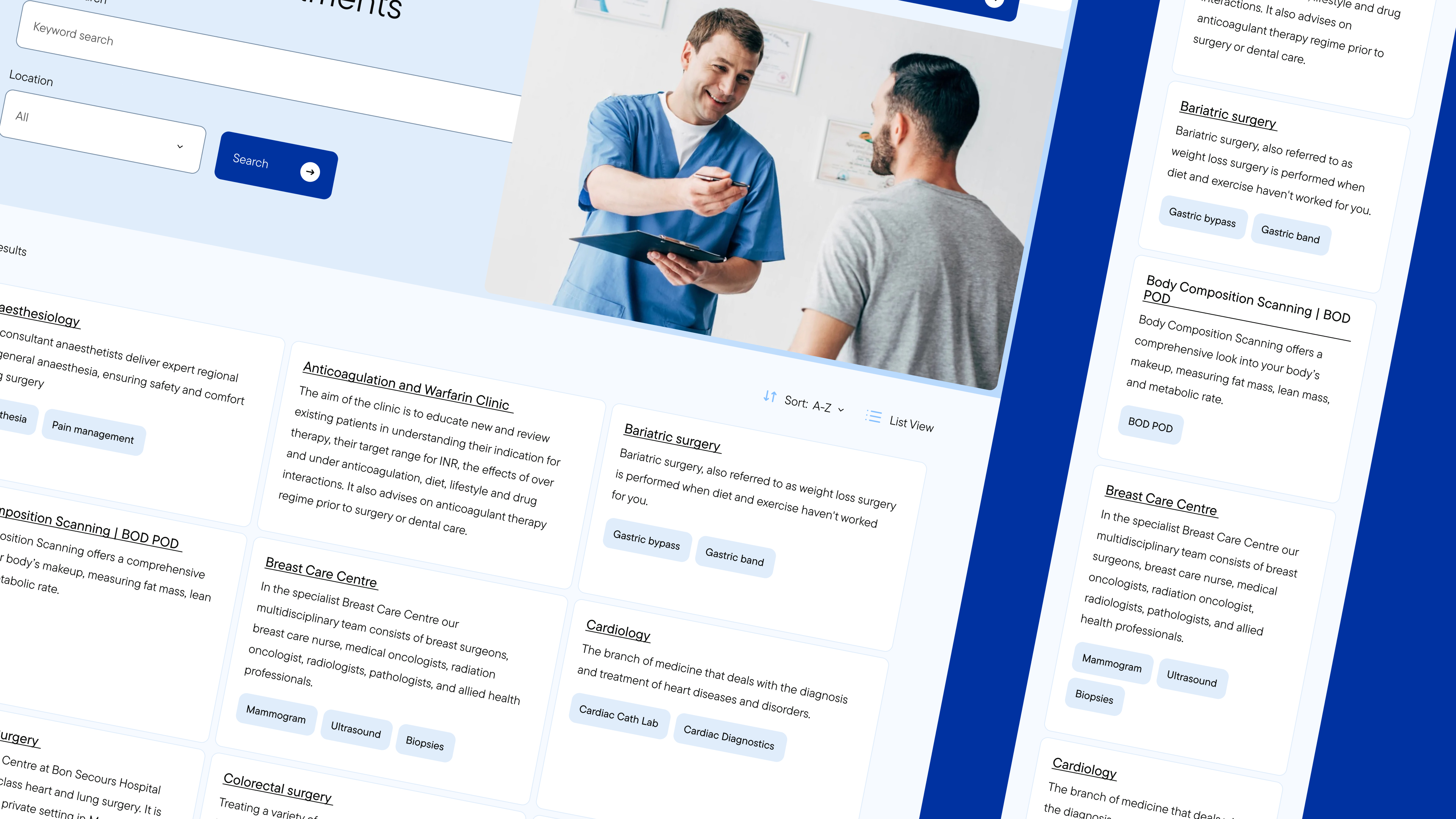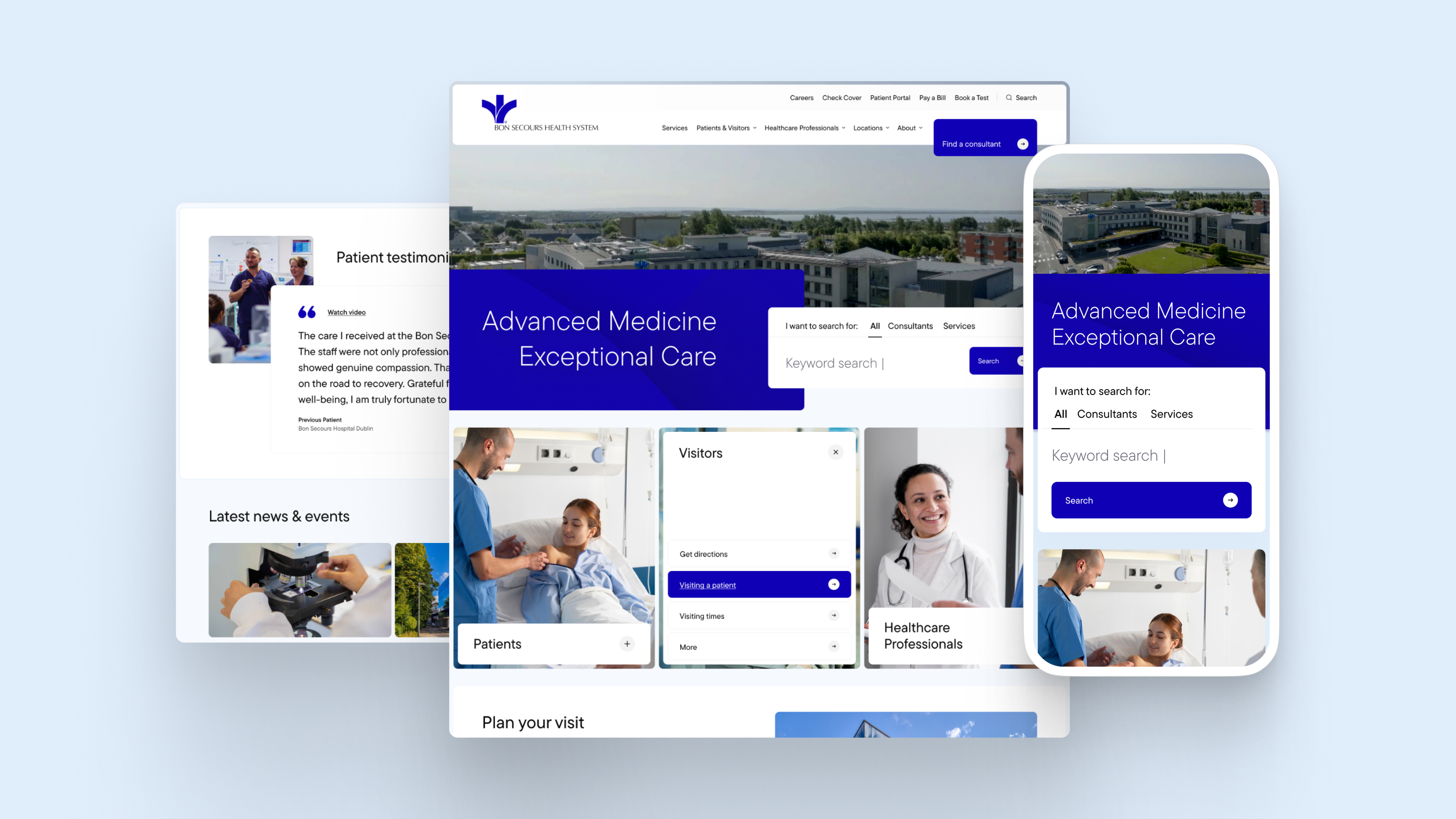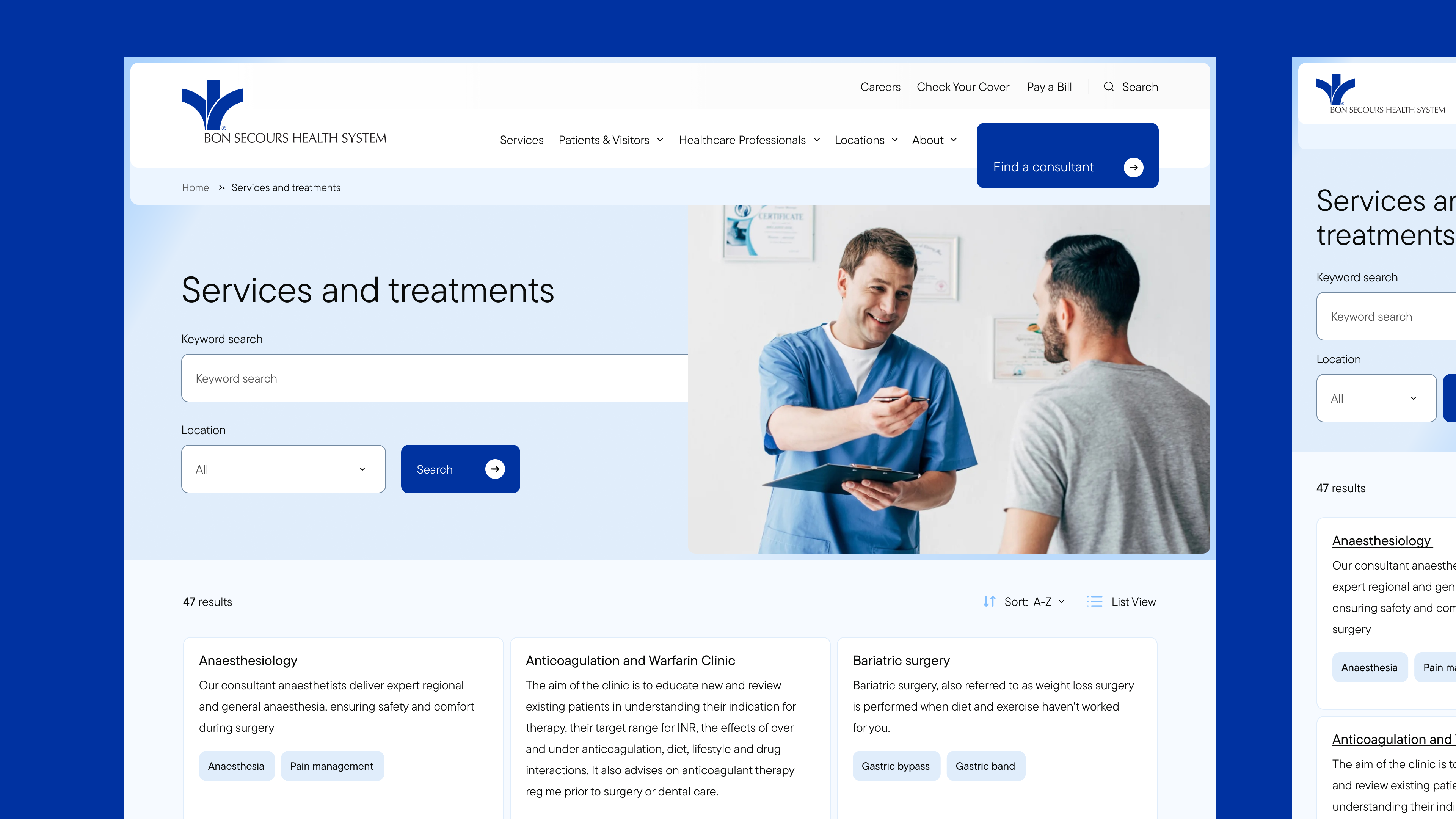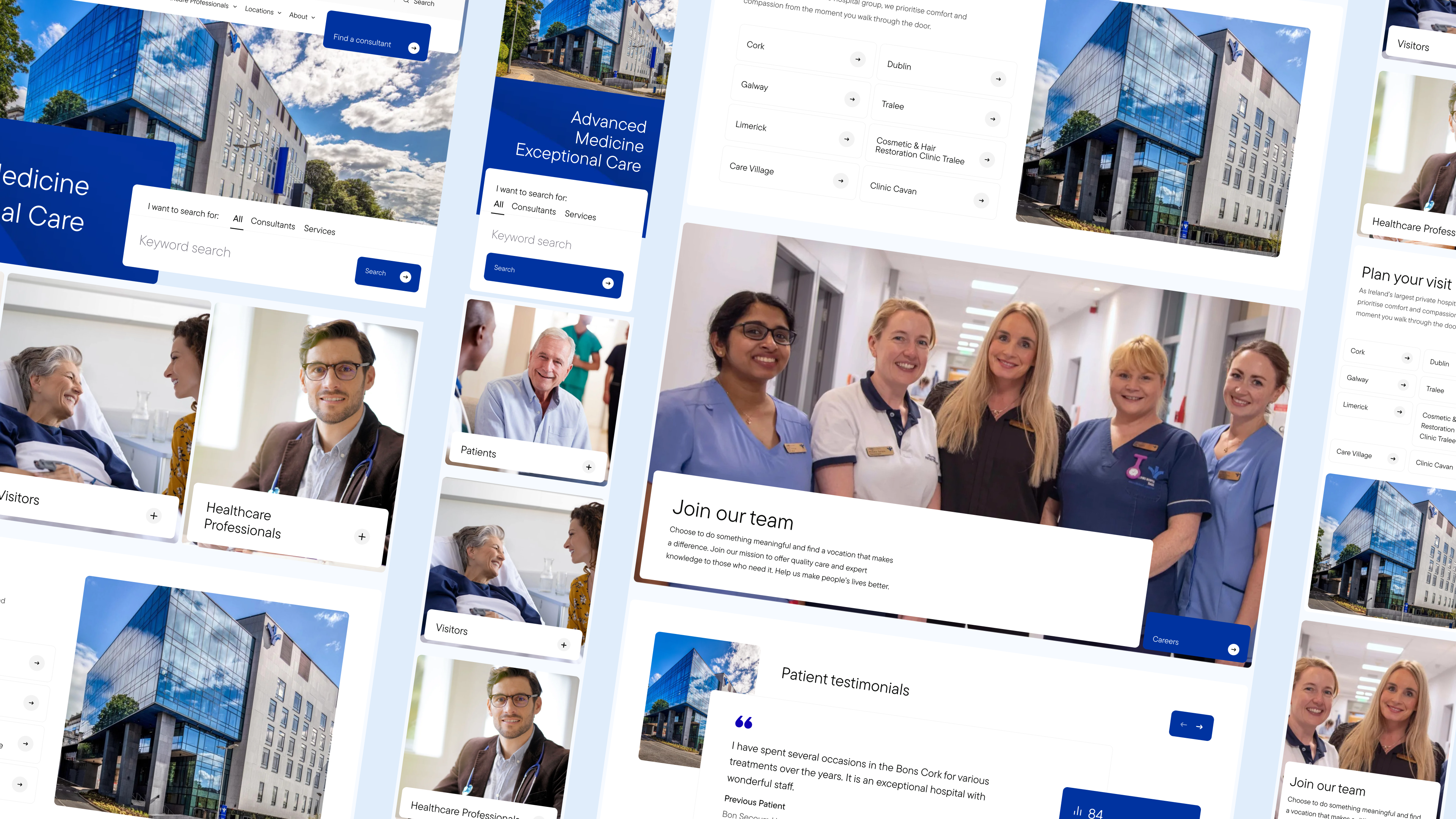 Kooba began the Bon Secours project with a methodical approach, identifying and researching a range of personas who would be interacting with the final website. The information architecture of the website was made according to these typical users and their predicted behaviour and needs. This included designing specialised landing pages for patients, visitors and healthcare professionals. This user-centric approach to the site’s layout ensured that a wide variety of users could easily access the information that was most relevant to them. It was also essential that key information could be quickly found across the site, and to address this a robust, filterable consultant directory was introduced, offering up-to-date details on specialties, availability, and costs, alongside enhanced search functionality for quick access to services and referrals.