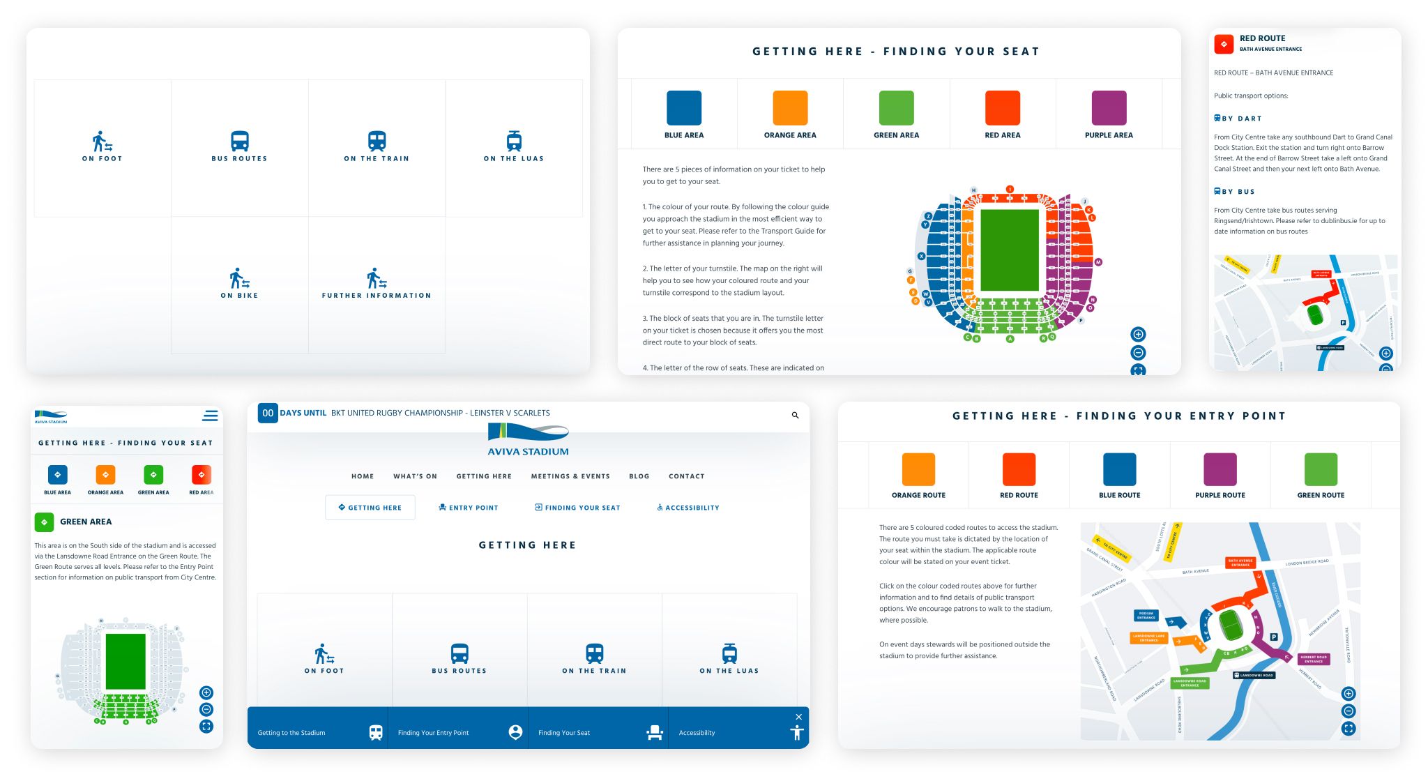 Our maps for the Aviva Stadium use a classic colour code, with details revealed depending on the colour selected. It makes it easy for attendees to navigate to the stadium, and to find their section once they arrive.