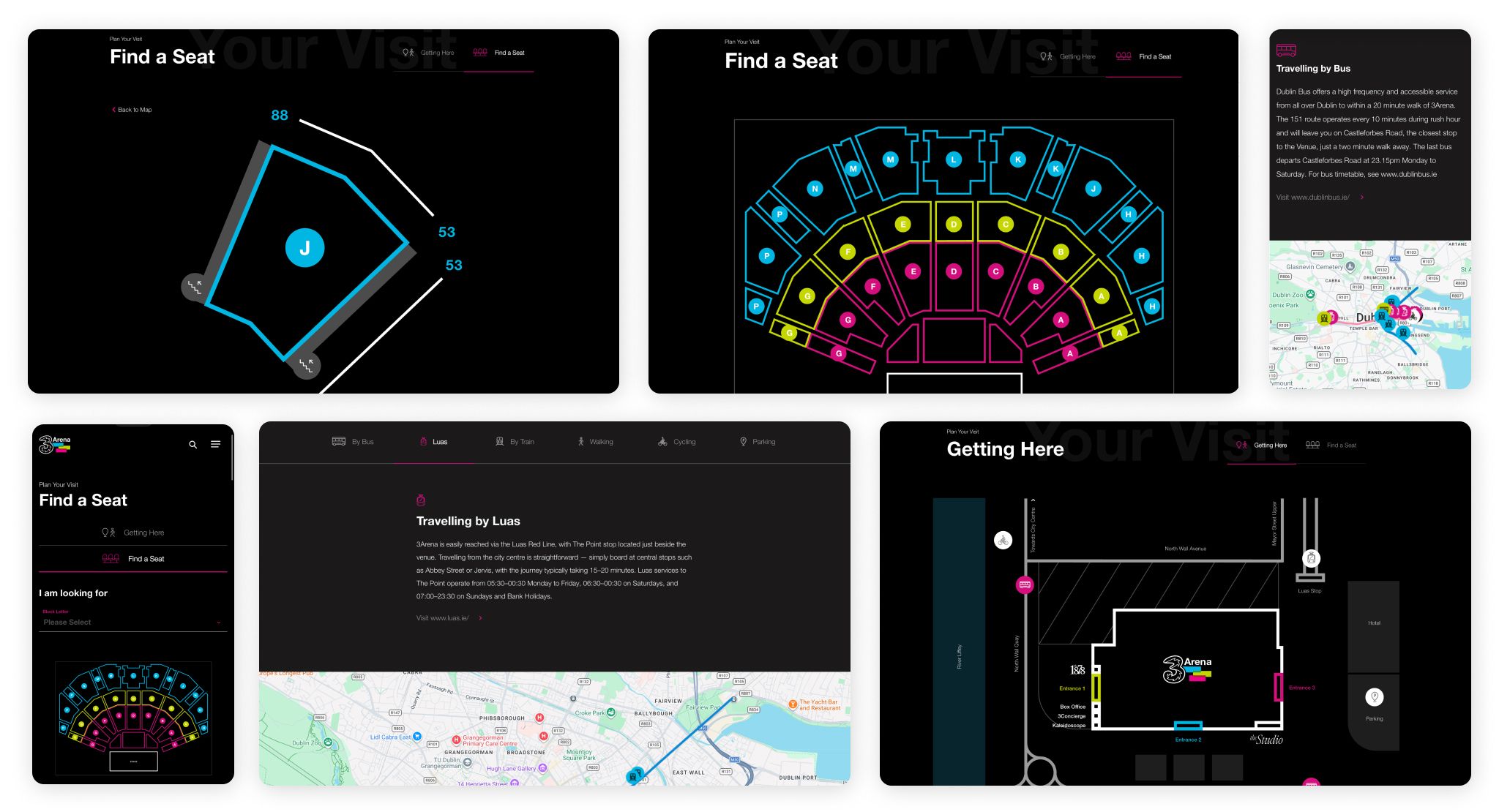Our wayfinding map for the 3Arena is stylistically minimal, with more information revealed as the user interacts with their assigned seating section. The result is an efficient experience that helps attendees access their seat quickly.