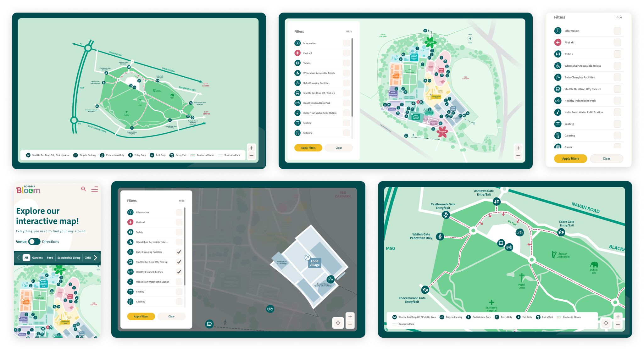 Our Bord Bia Bloom event map is more flexible, and is designed for users with a wide range of needs within the festival already. It includes filters to find specific resources, and interactive regions containing more details when needed.