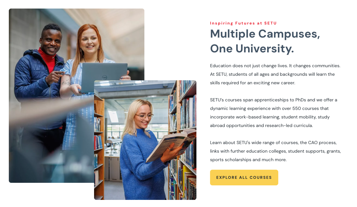 A good example is a “50:50”, one of the most common modules seen on websites. This consists of two blocks, one containing text and the other containing an image or multiple images. The image below shows a 50:50 on the SETU website, which has two images on one side and a header, some text, and a button on the other. If they’d like, the team at SETU could adjust any of this content, or they could re-use this module elsewhere on their website.